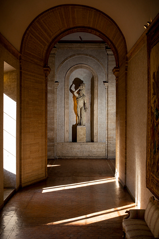''Entrare a Palazzo Farnese, vuol dire fermare le lancette degli orologi. Il tempo sembra passare molto lentamente, quasi sino a fermarsi. L’altezza delle volte, l'immensità dei corridoi, la sontuosità dei tessuti: credo che questo palazzo stimoli l’attività sensoriale in tutte le sue sfaccettature. Recentemente ho avuto la possibilità di fotografare quasi tutti gli ambienti: ciò che mi ha affascinato maggiormente è la cosiddetta Stanza rossa. Mi ha donato la sensazione del mistero. Le statuette bianche posizionate agli angoli della stanza su piccoli tavolini sono perfette in ogni dettaglio: sembrano prender vita da un momento all’altro, i lampadari che raffigurano donne vestite in eleganti abiti tradizionali sembrano cantare tutte in coro una canzone muta. L’odore del legno e dei tessuti che permea la maggior parte delle superfici della stanza e il suono ovattato mi trascinano in una sensazione di rilassatezza assoluta. Non soltanto un fatto fisico, quanto psicologico: la lentezza della grande Bellezza, da cogliere in ogni particolare, senza avere fretta di realizzare un'immagine quanto quella di immortalarne il senso, appunto. Nel pomeriggio, d’estate, la luce del sole attraversa i finestroni riscaldando ed illuminando i saloni: li rende quasi magici. Come se il tempo davvero fosse sospeso. Quando ho ripreso la statua d’Ercole, avevo la sensazione che il suo sguardo mi seguisse in ogni mio passo, quasi per controllare facessi bene il mio lavoro. Penso che il profondo legame tra la Francia e l'Italia sia rappresentato perfettamente dall'amore per la Bellezza, dal buon gusto e dall’amore incondizionato per l’arte in ogni sua forma ed espressione. A Palazzo Farnese mi sento letteralmente avvolto, coccolato e aver avuto la fortuna di fotografarlo così da vicino, con calma, ha fatto sì che sentissi tra me e le opere, quasi un rapporto di intimità, di esclusività. Oserei dire di familiarità: tale da farmi sentire a mio agio come se, tornandoci, fossi a casa ogni volta''.